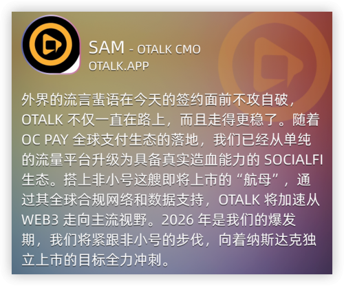 K 博士指出,非小号正在搭建自己的数字资产财库 (DAT),并将 OTalk 纳入“非小号 100 指数”标的。他认为,OTalk 是一个扎实做事的流量型产品,深耕 SocialFi 赛道,其价值将在资本的加持下得到重塑。